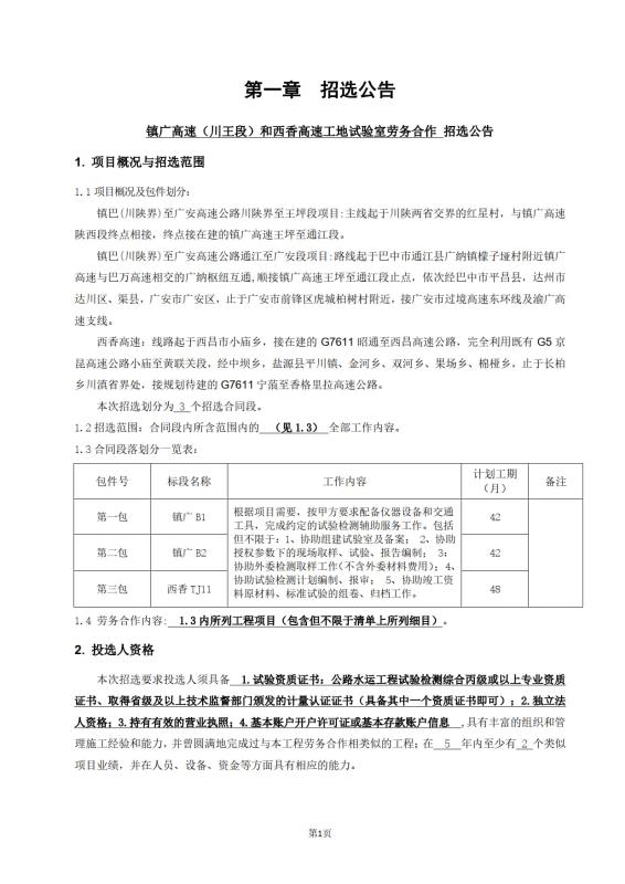 鎮(zhèn)廣高速(川王段)和西香高速工地試驗室勞務合作招選公告